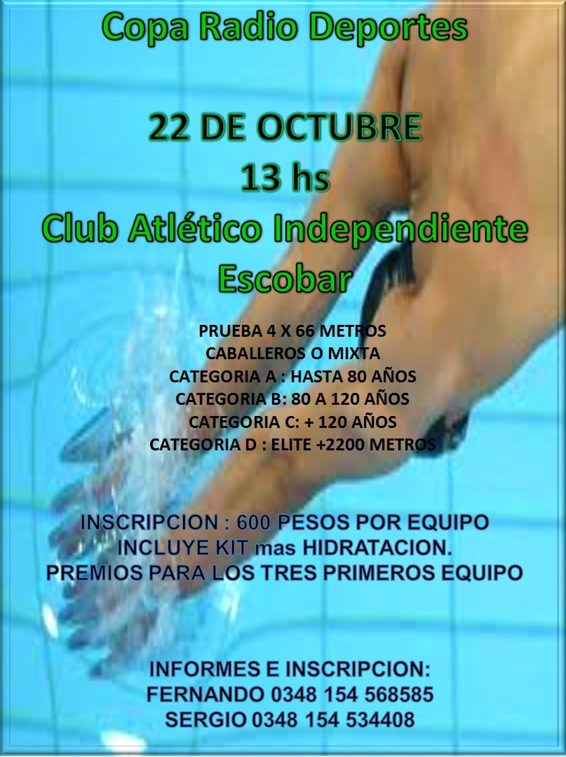 El natatorio del Club Independiente de Escobar pondrá en juego la tercera edición de la Copa RDE el sábado 22 del corriente a partir de las 13.00. La modalidad de competencia será de un sprint 4×66 metros duración: 40 minutos y pueden participar equipos mixtos tanto para nadadores libres, promocionales o federados. La inscripción es de 600 pesos por equipos.